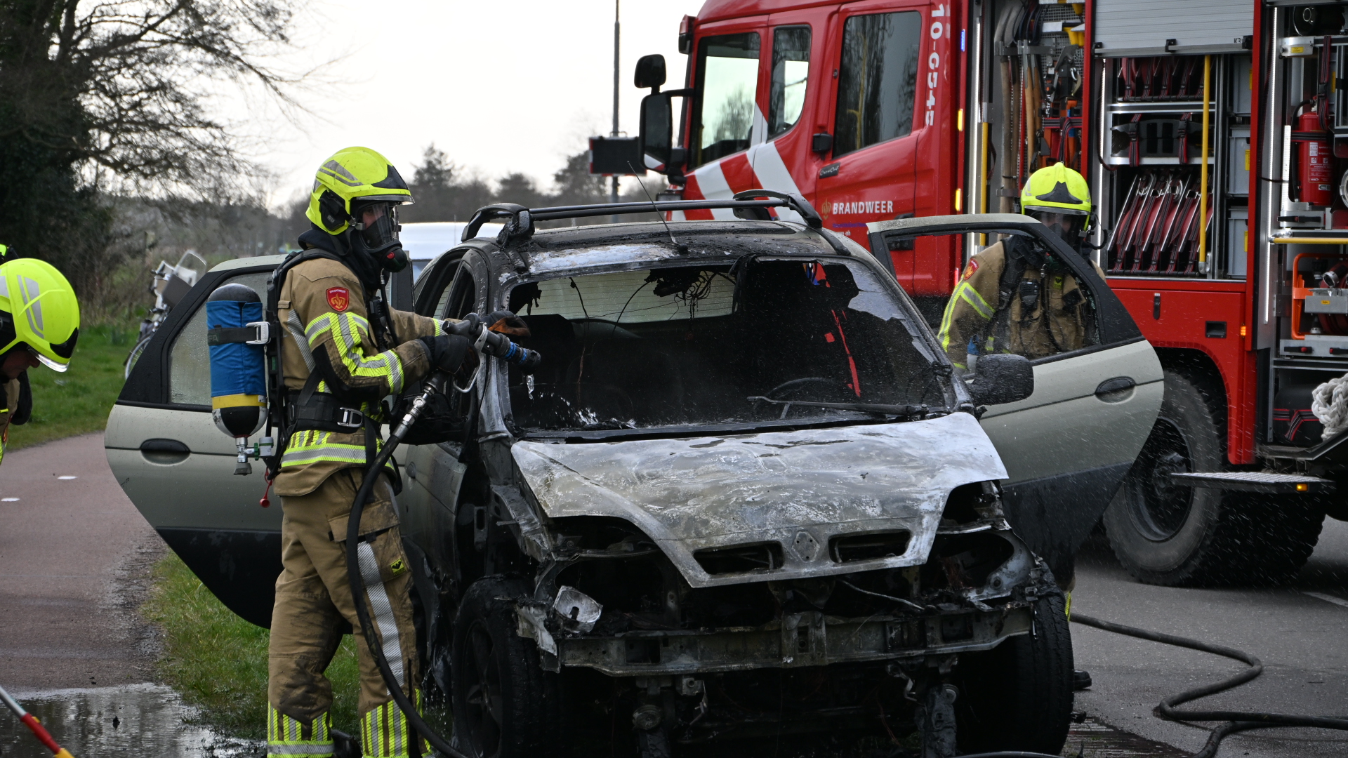 De brandweer rukte direct met spoed uit en kwam snel ter plaatse. Bij aankomst stond het voertuig al in lichterlaaie. Brandweerlieden wisten het vuur snel onder controle te krijgen, maar de auto kon niet meer worden gered en brandde volledig uit.