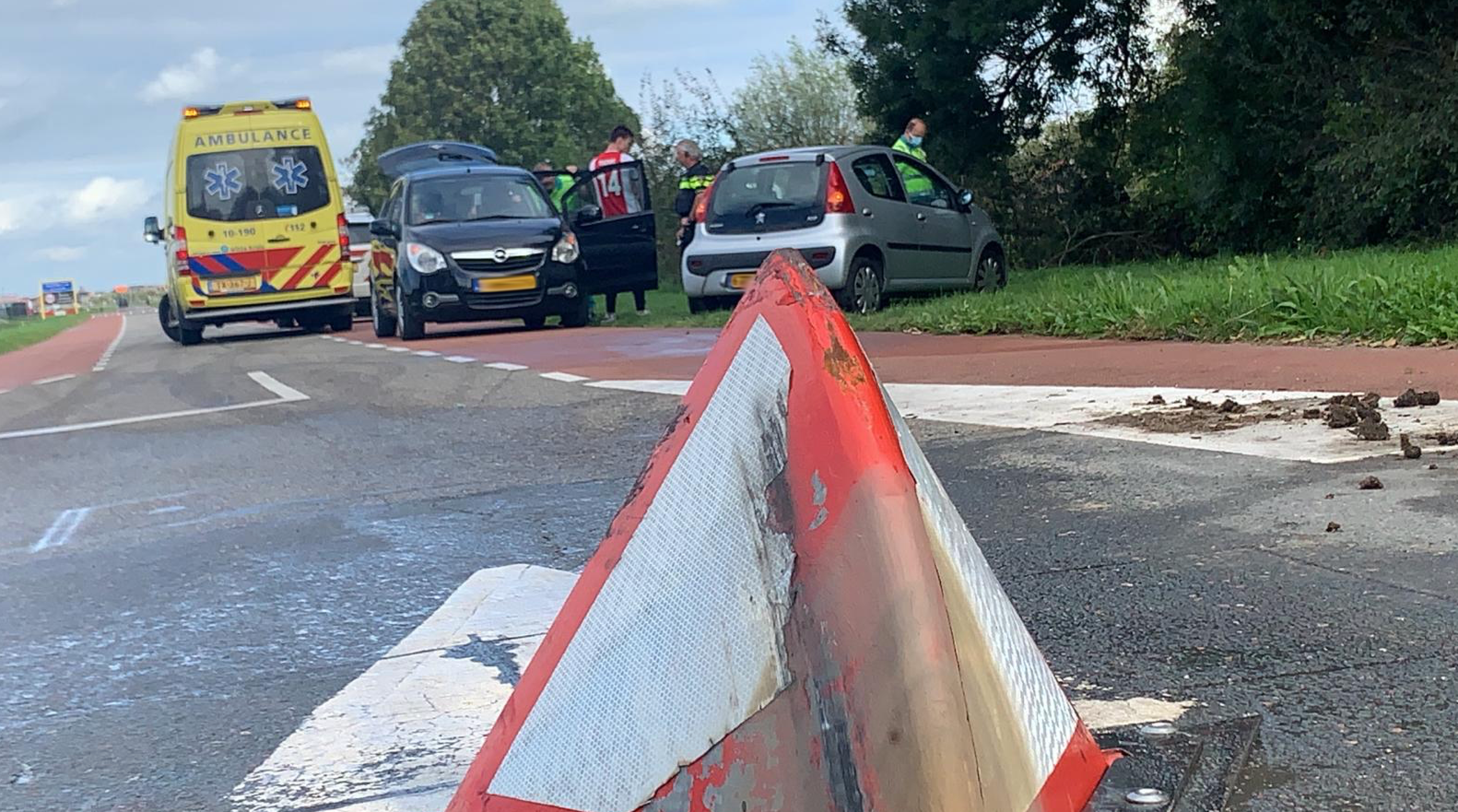 Op de weg is een verkeersbelemerende driehoek met stoplichten en iedere 30 seconden kan er weer een auto door rijden, de vrouw is hier overheen gegaan maar nu blijkt dat de driehoek spontaan omhoog is gegaan, de vrouw heeft aan deze knal ontzettende last van haar nek overgehouden. Ambulancepersoneel heeft haar nagekeken maar de dame hoefde niet mee naar het ziekenhuis.